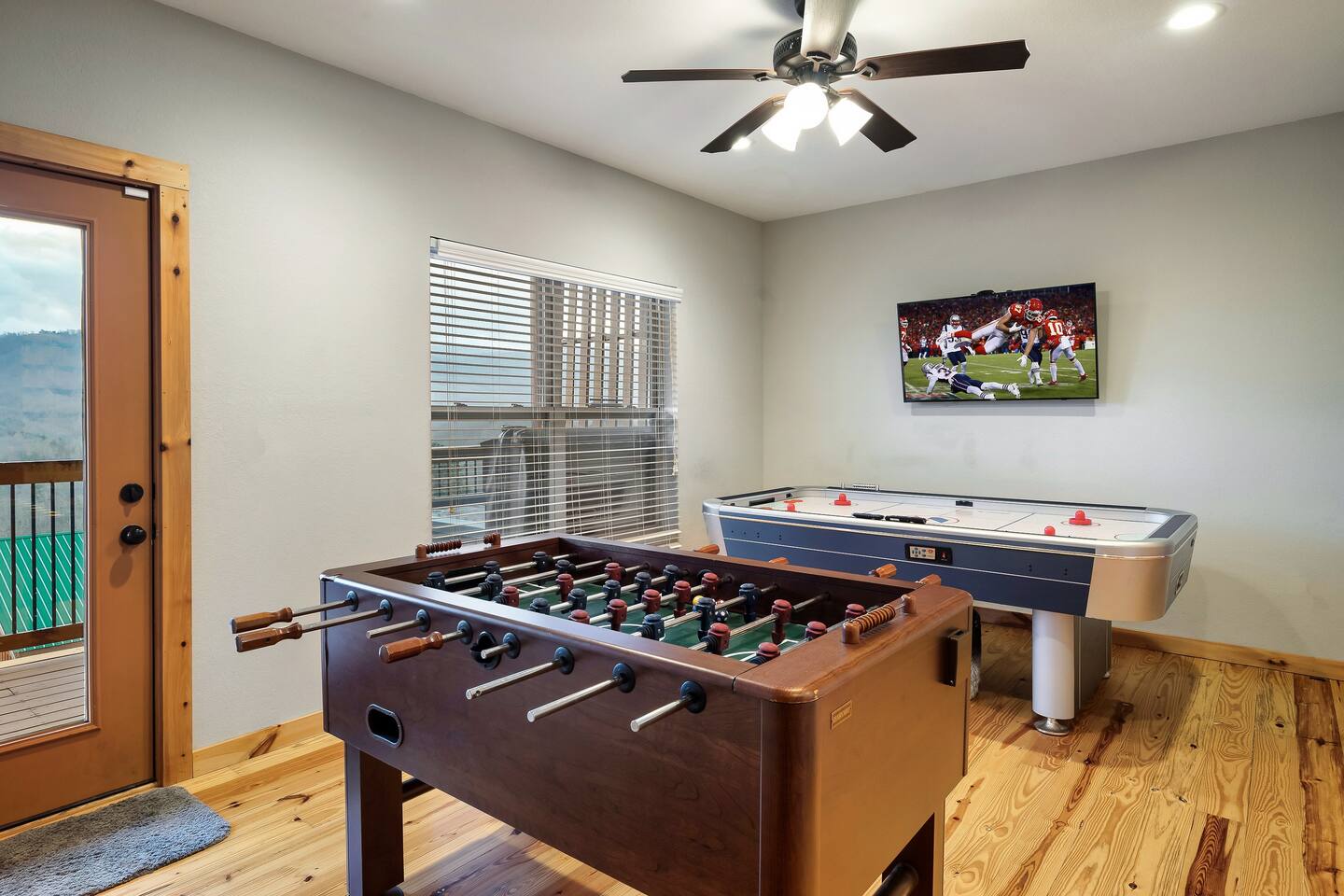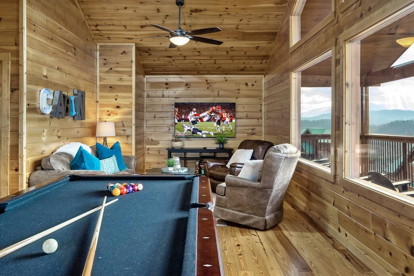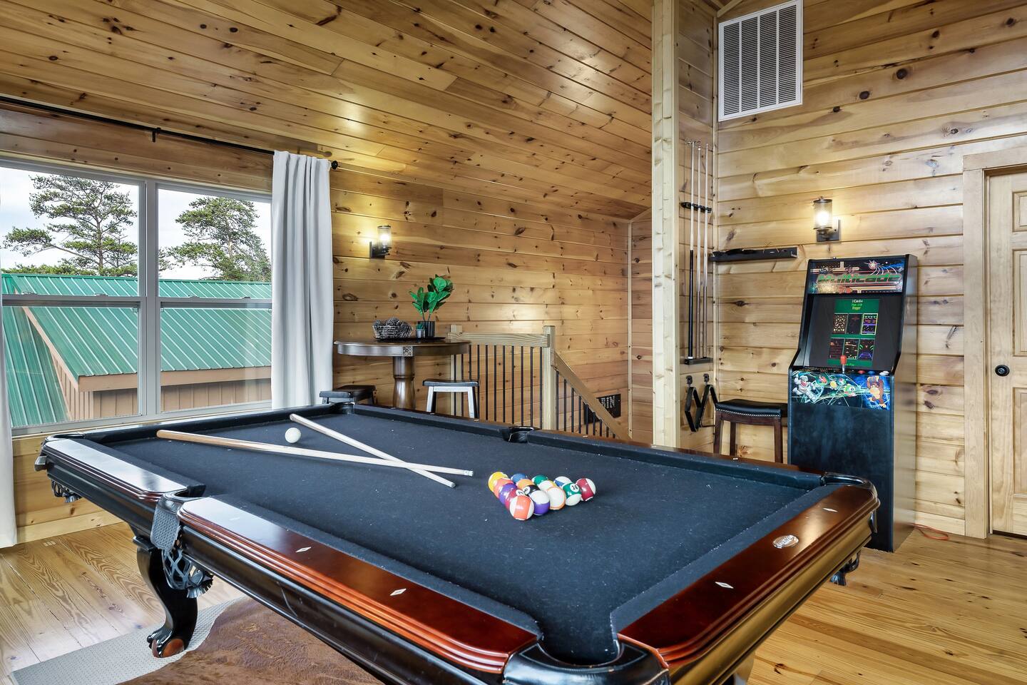 Managed by Sky & Cedar Properties; message for more information or check out our IG page: skyandcedarproperties. This rustic two-story log cabin is perched just minutes away from Pigeon Forge against the backdrop of a beautiful mountain range. With an open floor plan and plenty of windows for natural lighting, there’s a lovely view wherever you look. The cabin’s interior feels cozy yet spacious, furnished with modern amenities and decorated to feel warm and inviting. For entertaining, the entire cabin is furnished with ample seating and many activities to keep you busy during your stay, including pool, foosball, air hockey, and ping pong. An arcade machine, a theater room, and numerous televisions provide extra entertainment during your downtime. All three stories offer a covered deck where you can sit and enjoy the fresh mountain air and stunning scenery. Soak in the views from the comfort of the hot tub or a rustic rocking chair. When you’re ready to wind down for the night, the cabin’s three bedrooms are decorated to match the mountain views, furnished with luxurious amenities to make it a perfect place for resting after a day of exciting adventures in The Smokies. ★ LIVING ROOM ★ It immediately feels like home, with the lively fireplace, a comfy sofa, a coffee table for drinks and snacks, and a smart TV for watching sports events, favorite shows, or movies. - Comfortable Sofa with Pillows - Smart TV + cable - Indoor Fireplace - Coffee Table - Reading Lights ★ KITCHEN & DINING ★ It is fully equipped with state-of-the-art cooking appliances that make it suitable for preparing any meal, whether a simple breakfast, quick snack, or a three-course gourmet dinner. Spacious countertops provide plenty of room for you to work your culinary magic. - Microwave - Stove - Oven - Refrigerator/Freezer - Dishwasher - Sink - Hot & Cold Water - Glasses - Silverware - Pots & Pans - Coffee Pots- Keurig and Drip (BYO Pods and Ground Coffee) Serve your delicious homemade meals at the lovely dining table nestled right next to the kitchen. - Dining Table with Seating for 8-10 - Seating at Bar for 2 ★ SLEEPING ARRANGEMENTS – BEDROOMS ★ Rest and relax in the highly comfortable bedrooms located on each level of the cabin. ♛ Master Bedroom - King-Size Bed with Pillows, Linens and Sheets - Smart TV - Closet with Hangers and Shelves - Dresser with Spacious Drawers - Night Stands with Reading Light ♛ Upstairs Bedroom - King-Size Bed with Pillows, Linens and Sheets - Smart TV - Closet with Hangers and Shelves - Dresser with Spacious Drawers - Night Stands with Reading Light ♛ Lower Bedroom - Two Bunk-Beds with Pillows, Linens and Sheets - Smart TV - Closet with Hangers and Shelves - Dresser with Spacious Drawers ♛ Main Floor Living Room - Queen Sleeper Sofa (Linens and pillows provided in bedroom closet) ♛ Upstairs Living Room - Queen Sleeper Sofa (Linens and pillows provided in bedroom closet) ★ BATHROOMS ★ The charming cabin features three full relaxing bath with clean towels and essential toiletries (hand soap and shampoo) for maximum comfort and convenience. Toilet paper is provided. BYO toiletries. - Bath with a Shower - Shower - Vanity - Mirror - Toilet - Towels - Hair Dryer - Essential Toiletries ★ OUTDOOR AREAS ★ An elegant cabin like this one would not shine in its best light if it did not have a well-built private deck where you can relax and enjoy the majestic natural environment. - Three Spacious Decks with Mountain Views - Rocking Chairs - Hot Tub The cabin offers cozy accommodation and amenities in great forest settings. Let it be your primary choice when visiting The Great Smoky Mountains. We are looking forward to hosting you!